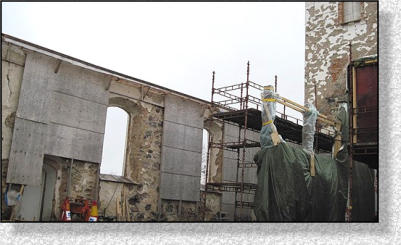 Tegel och huggen sten efter rivningen, togs tillvara och skolungdomar hjälpte under sommarlovet 2009 till att göra dem rena från murbruk så att de kan användas vid återuppbyggnaden. En del av