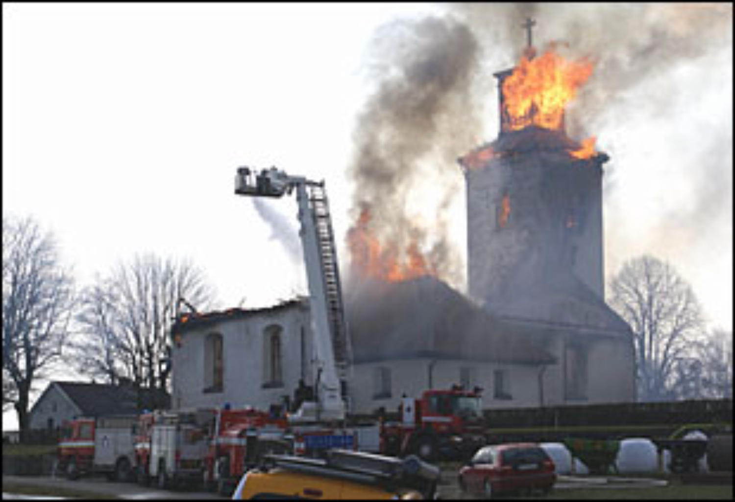 Tillslut spred sig branden även till kyrktornet och inget av kyrkan återstod att rädda. Sammanlagt försökte ett 25-tal brandmän