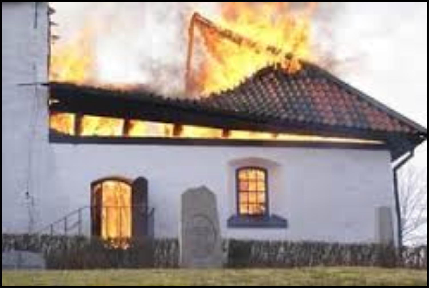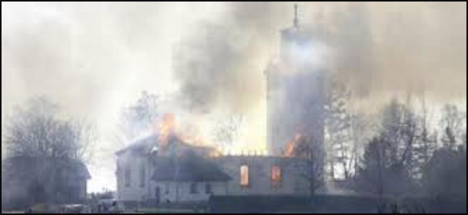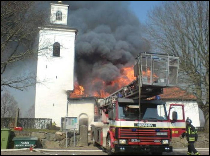 sprutade vatten mot taket övertändes kyrkan och taket rasade in (se länk). Det hördes en explosion samtidigt som ett eldklot