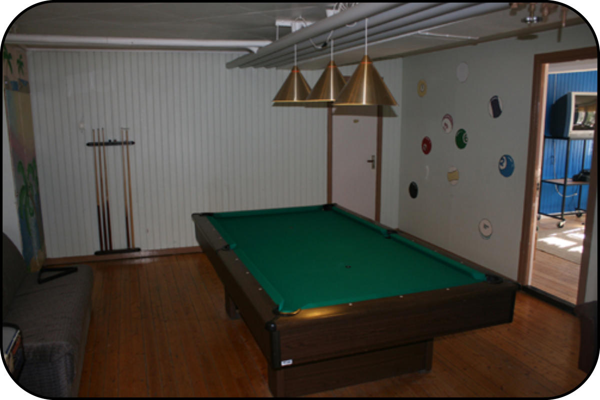 Samlingssalen innehåller bardisk, bord och stolar samt TV. Det finns ett biljardrum med biljardbord, samt ett “mysrum”